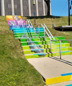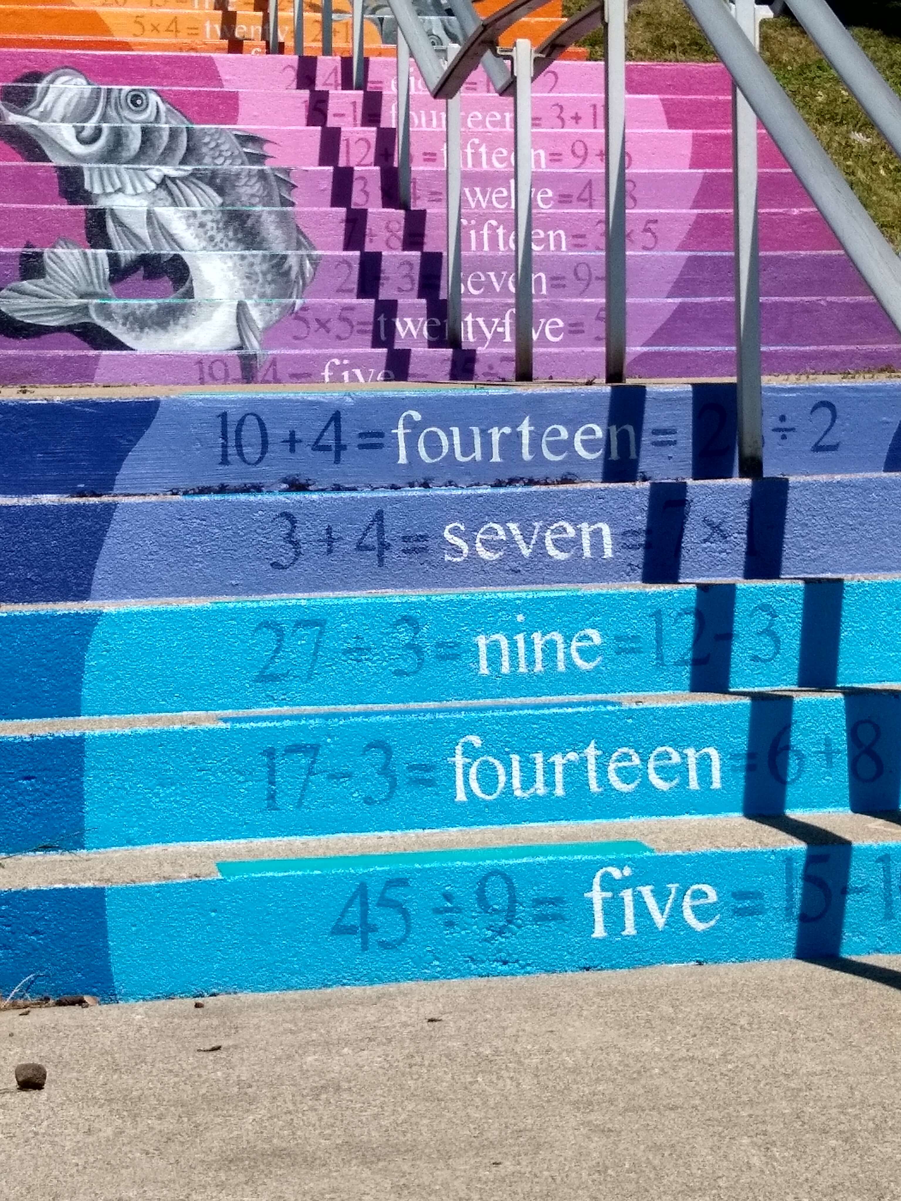 The Clinton River stairs artist, Wendy Popko, added “While I was working on the stair mural in downtown Mount Clemens, I met several residents and non-residents of all ages. But there was a 10-year-old boy named Cam, who was on a walk with his mom. They stopped by to see what was going on, and I could hear Cam muttering the equations and how he knew the answers. How “easy” they were. Just as Cam and his mom started to walk away, I said, “Did you solve the puzzle?” And that’s all it took. Cam wanted to know more. I gave him the clue (the answers to the “simple” equations represented the letters of the alphabet. 1=A, 2=B, 3=C, etc.). Cam couldn’t wait to solve it. I gave him a sheet from my sketch pad, and off he went climbing the steps to crack the code. It took him about 10 minutes to solve the puzzle. He thanked me, and his mom took a picture of the two of us together in front of the mural and shared it on social media.”