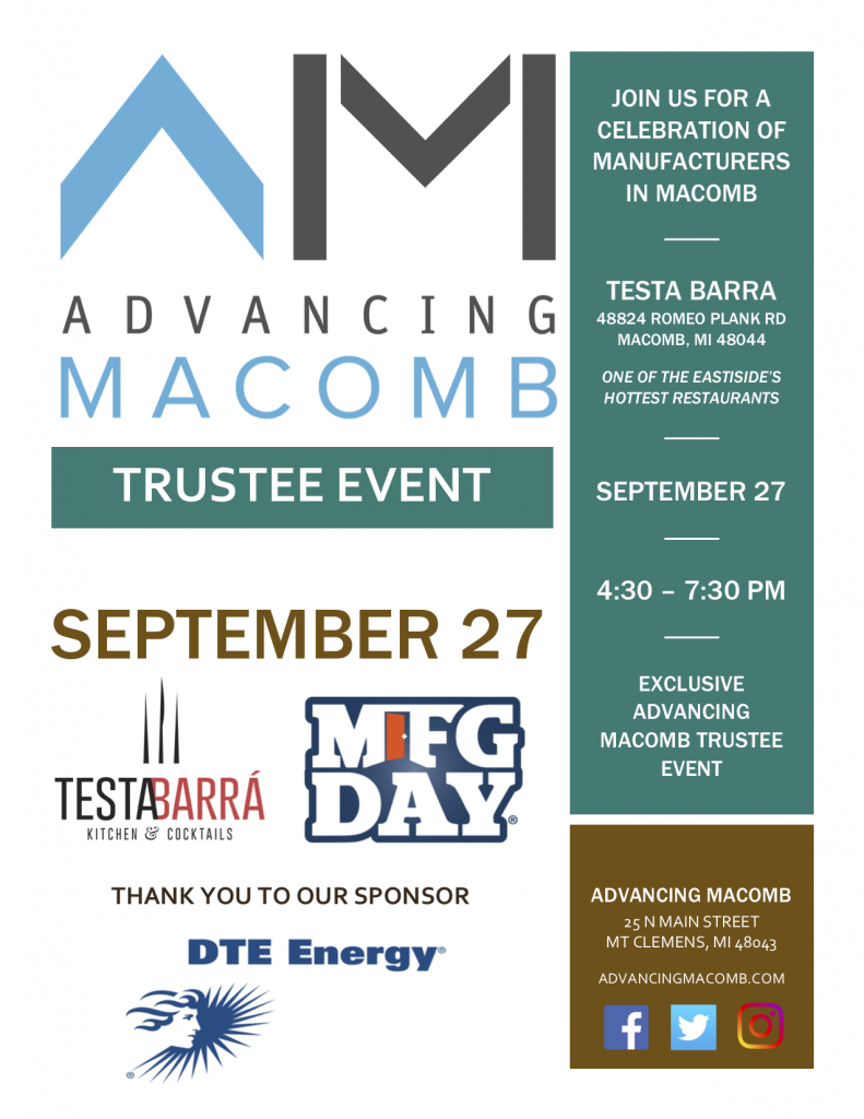 The next exclusive event for the Advancing Macomb Trustees will be held on September 27, 2018 from 4:30 p.m. – 7:30 p.m. at Testa Barra – one of the Eastside’s hottest restaurants. We will be celebrating manufacturers in Macomb County in advance of Manufacturing Day 2018. This event is generously sponsored by DTE Energy.